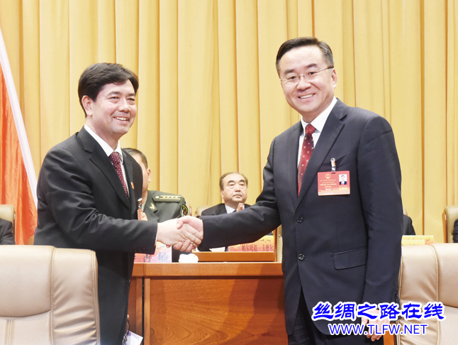 1月17日下午,市委书记张文胜与新当选的市人民政府市长买买提明·卡德(左)亲切握手。吐鲁番日报 刘健 摄