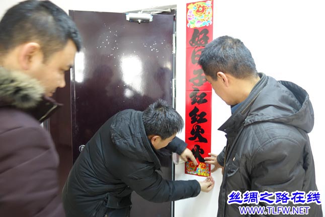 "往左边点…好…可以了。"2月13日,市政府办干部许雷带着大家贴对联。随着新春佳节的日益临近,托克逊县夏乡布拉克佰什村处处洋溢着喜庆祥和的节日气氛。会议室里,返乡大学生正在排练着春节要表演的节目。村委会里大红灯笼挂起来,对联、"福"字也贴在了办公室的门上,村委会到处都充满了浓浓的年味。(孙丽萍)