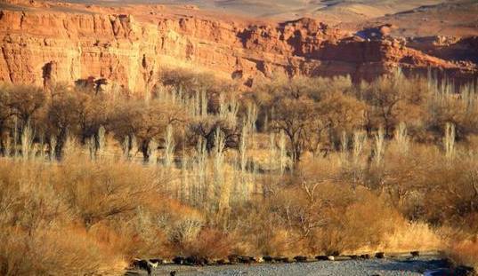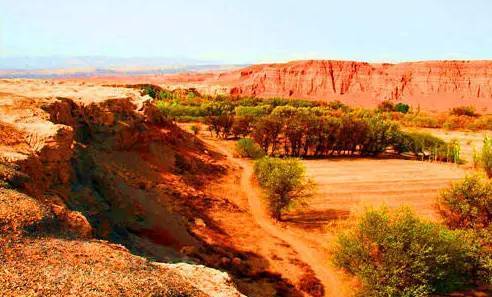 这里有一座被称为艾格(维吾尔语,拐点的意思)的村庄,犹如这个村庄的名字一般,时间老人在这里停歇,几十年前洪水过后的小山村荒废后基本保持了当时的原貌。到了秋冬季节,河谷内金黄色的芦苇荡在微风中摇曳,鸟儿在低空盘旋觅食,一排排的红柳林密密麻麻的散布在河谷内,犹如忠诚的守卫者;一缕青烟从农户家的烟囱中冒出,一幅静逸悠然的景色。我们现在看到的一片片树林,有是柳树林、桑树林、榆树林、杨树林,还有红柳和各种叫不上名的花草。