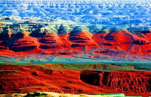 天山红河谷的崖壁,是红白相间的彩丘红层,那大多是软弱的泥质层,因为彩丘是属于干旱地区的地貌,它的表面没有枯枝落叶的覆盖,没有腐朽了东西的染色,保持着极为原始的丰富色彩,这种色彩是红白相间的。