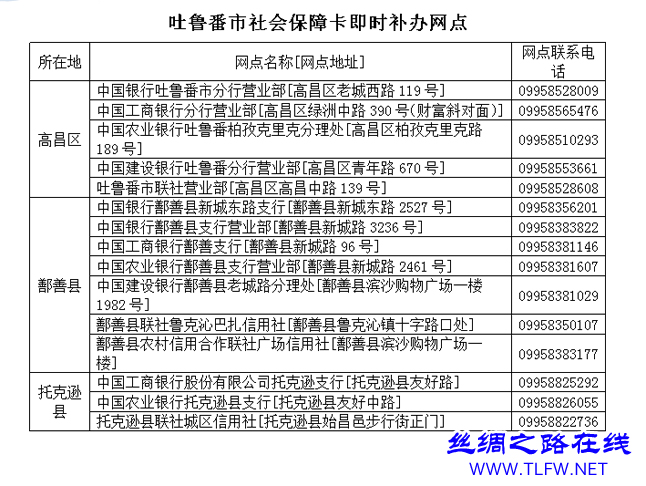 据了解,为贯彻落实党的十九大精神,方便参保群众办理社会保障卡相关业务,推进社会保障卡在公共服务领域的应用,吐鲁番市人社部门会同各社会保障卡金融合作银行,在前期试点运行的基础上,委托全市7个金融机构15个社会保障卡即时补办网点,自2018年6月11日起实现社会保障卡挂失、补办等相关业务在银行“一站式”办理,为参保群众提供更为快捷方便的服务。
