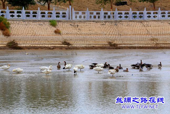 人工放养的麻雁和白天鹅一起在白杨河托克逊县城区段内