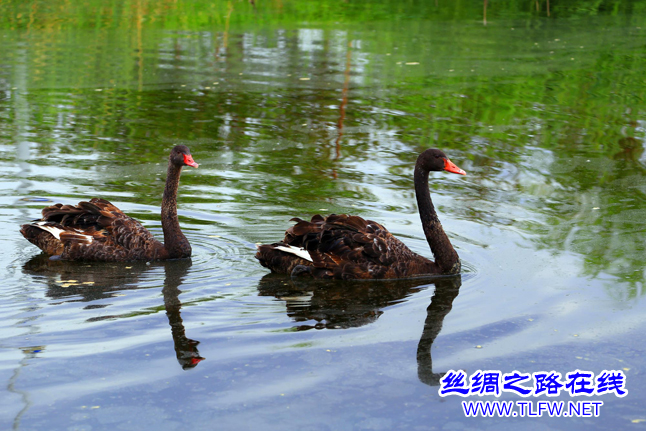 家养黑天鹅也在月光湖里觅食嬉戏