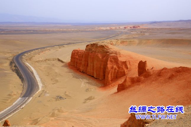 从托克逊县伊拉湖镇阿克塔格村出发约20公里左右,一处高约10米,宽约20米的红色竖状山体屹立在公路一侧,山体呈通红色,山体顶端被黄色土层覆盖,山体底端散落着很多红色的土渣。