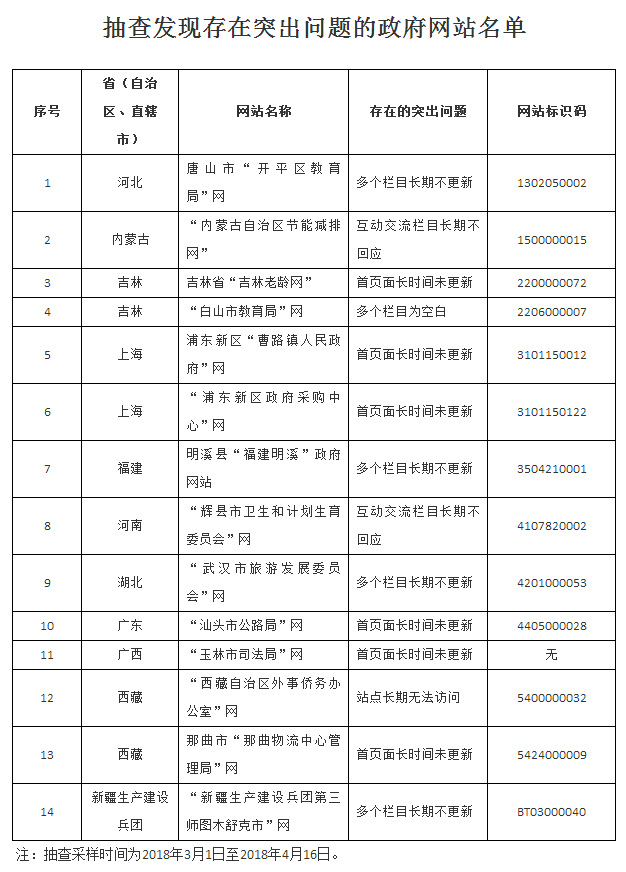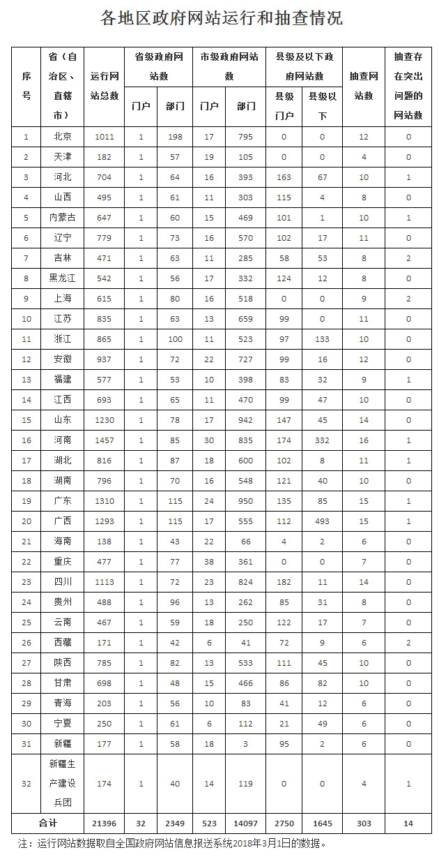 为深入贯彻习近平新时代中国特色社会主义思想和党的十九大精神,落实《国务院办公厅关于印发政府网站发展指引的通知》(国办发〔2017〕47号,以下简称《指引》),推动各级政府网站运用信息化手段方便企业群众办事、回应社会关切、构建一体化在线服务平台,按照工作安排,国务院办公厅政府信息与政务公开办公室(以下简称国办信息公开办)近期组织开展了2018年第一季度全国政府网站抽查。现将有关情况通报如下: