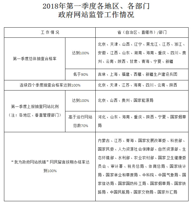 第一季度,国办信息公开办随机人工抽查各地区政府网站303个,总体合格率95%。其中,北京等21个地区政府网站抽查合格率为100%;北京、天津、江苏、海南、四川、云南、陕西连续四个季度抽查合格率达100%。各地区、各部门共抽查本地区、本部门政府网站11639个,占运行政府网站总数的50%,总体合格率95%。经抽样复核,地区和部门抽查情况整体真实准确,抽查情况和问题网站名单已在中国政府网公开。