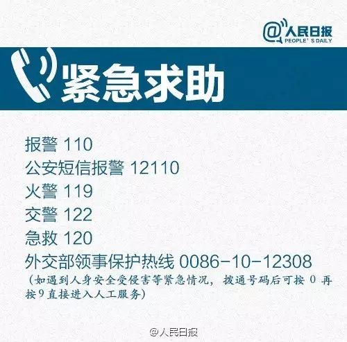 记住这个电话:12308!中国公民在国外遇困难就拨它!这是外交部全球领事保护与服务应急呼叫中心热线。中国公民在国外遇到遗失护照、发生意外等情况,可按拨打国内长途座机方式拨打0086+10+12308。如遇到人身安全受侵害等紧急情况,拨通号码后可按0再按9直接进入人工服务。转发提醒!