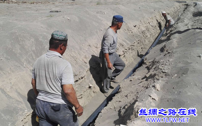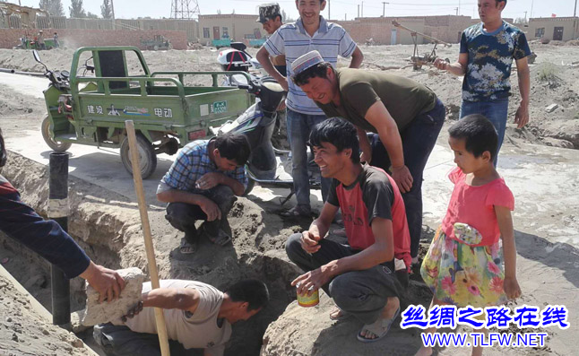 “买买提、艾合买提、阿里木……你们几个负责挖坑,热西提、托乎提、沙拉木……你们几个负接管子,女人们也帮忙挖一下,大家热了就喝点水,天热了大家就休息休息,下午天凉快点大家再接着干。”三组的队长阿帕·艾提积极动员群众,“我们大家要珍惜这个好机会,渠修好了,秋天在渠两旁栽些树,以后夏天我们就可以在树下乘凉,我们的村就会变得更美了……。”