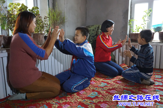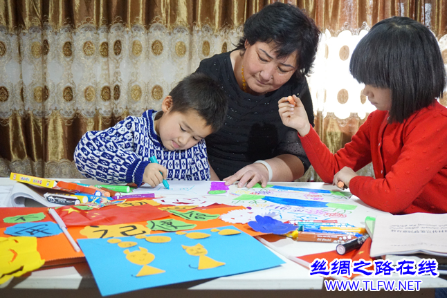 在五星小学教师谢小园“结对亲戚”家中,谢小园和另外两位老师正在给家中三个孩子辅导作业、教他们做“十九大手抄报”。屋子里充满欢声笑语,大家相处的非常融洽。正在上幼儿园大班的衣舍然木·依布拉依木为我们跳了一段刚学的民族舞,他开心的说:“老师来我们家,教我们画画、唱歌、做游戏,我们很开心。”